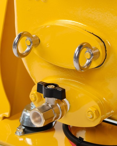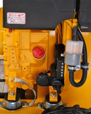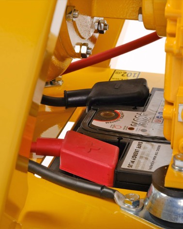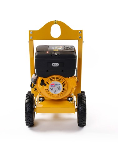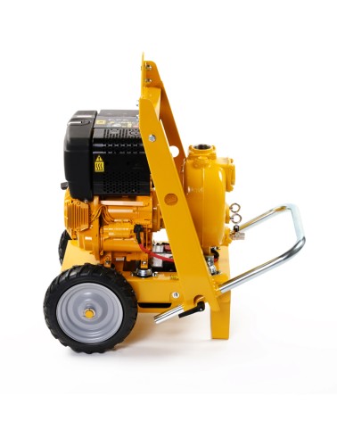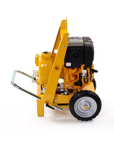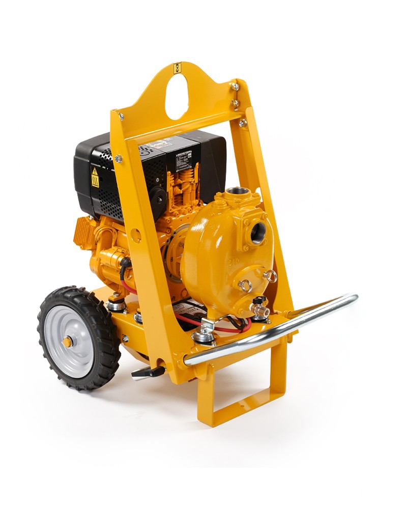 2” Selbstansaugende Kreiselpumpe aus Grauguss mit Gleitringdichtung mit Fettschmierung zum verbesserten Notlauf, Ventilklappe in der Saugseite, Dieselmotor und Batterie 45 Ah, montiert auf Handwagen mit Hebeöse und Vollgummiräder.