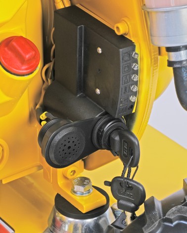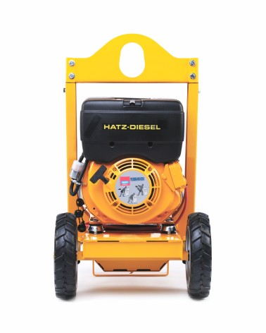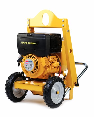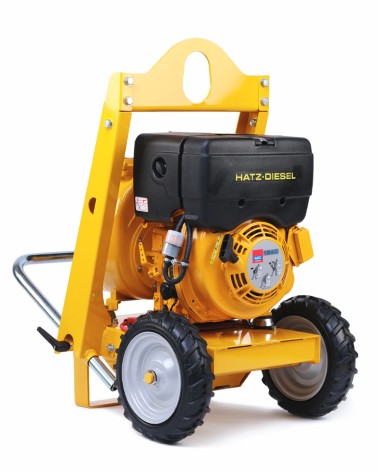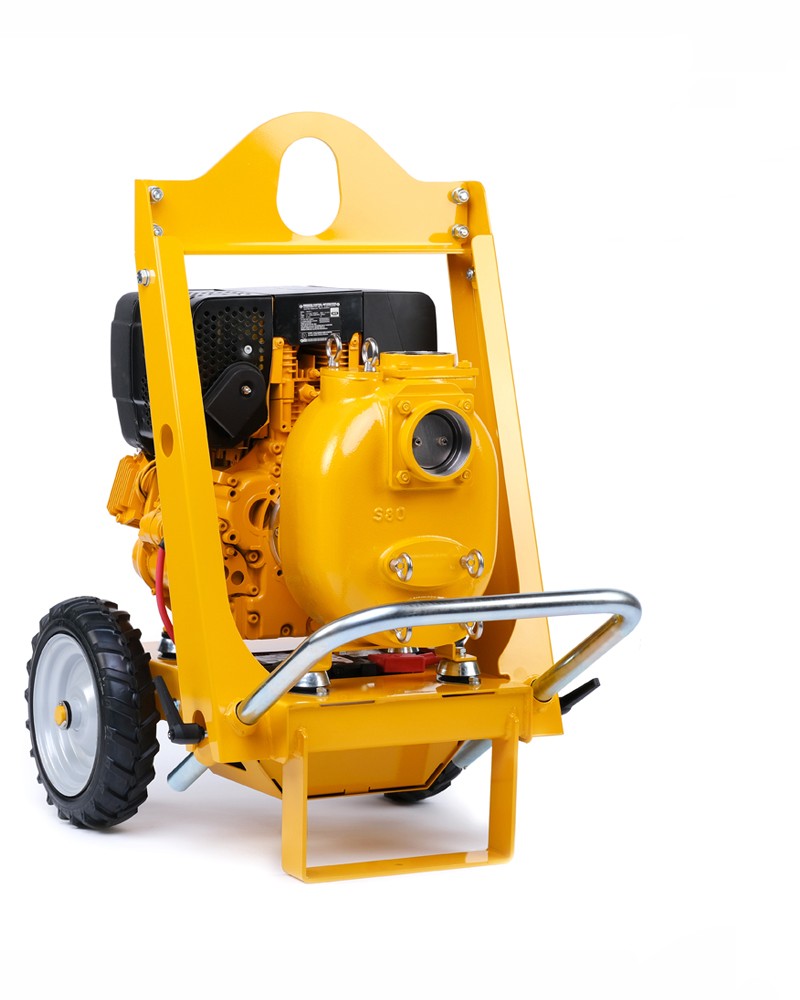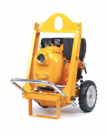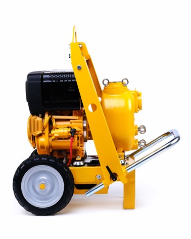 3” Selbstansaugende Kreiselpumpe aus Grauguss mit Gleitringdichtung mit Fettschmierung zum verbesserten Notlauf, Ventilklappe in der Saugseite, Dieselmotor und Batterie 45 Ah, montiert auf Handwagen mit Hebeöse und Vollgummiräder.