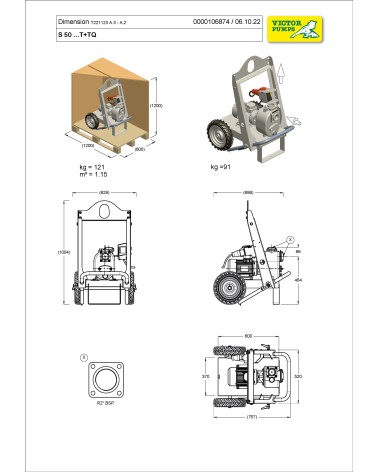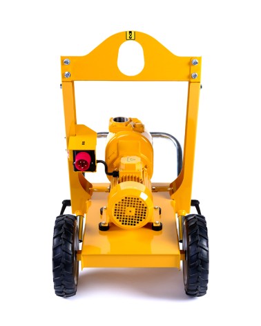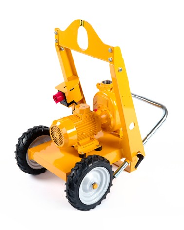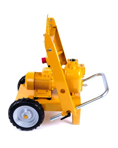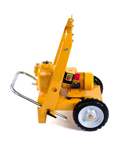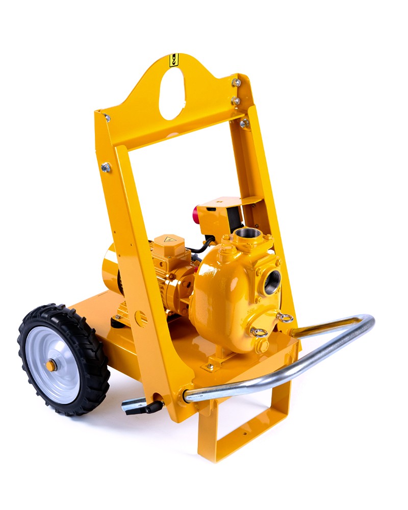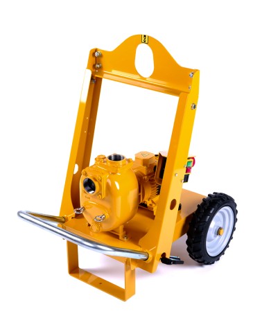 2” Self-priming centrifugal pump in cast iron with mechanical seal, grease-lubricated, non return valve and 2,2 kW electric motor close coupled, mounted on trolley with lifting hook and rubber wheels.