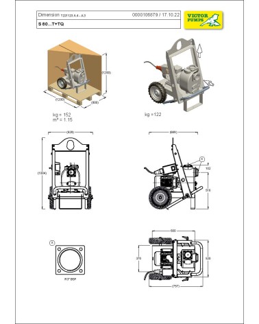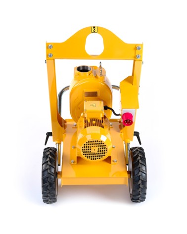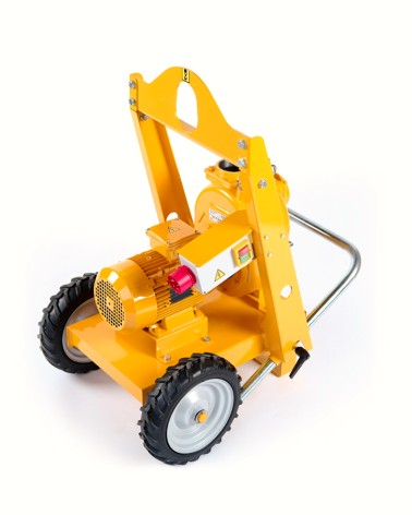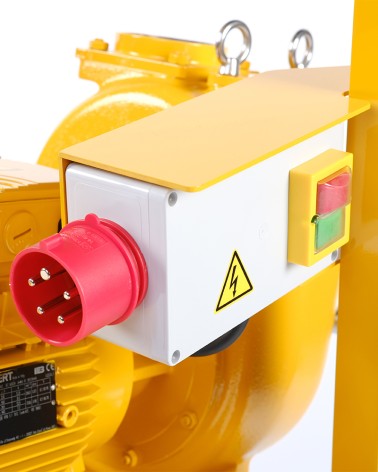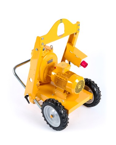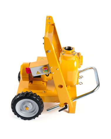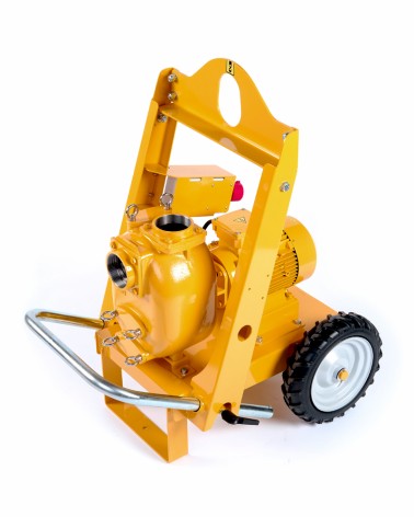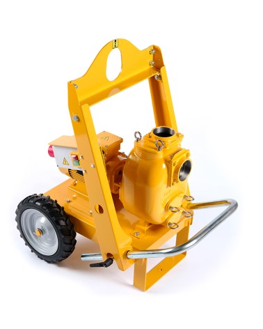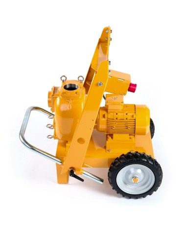 3” Self-priming centrifugal pump in cast iron with mechanical seal, grease-lubricated, non return valve and 4 kW electric motor close coupled, mounted on trolley with lifting hook and rubber wheel.