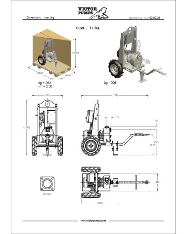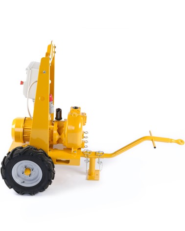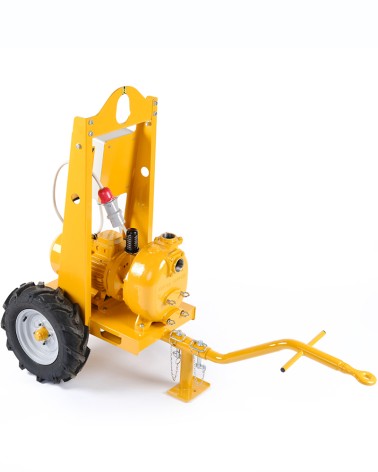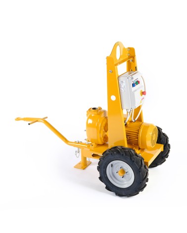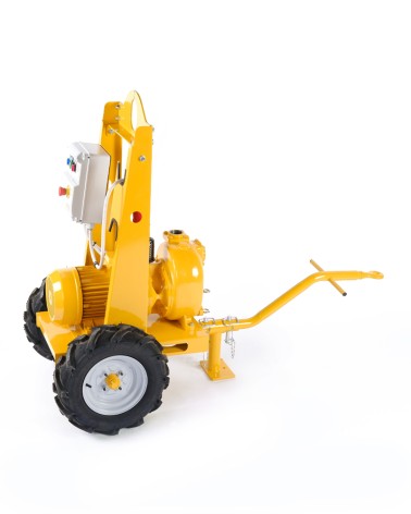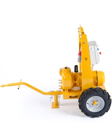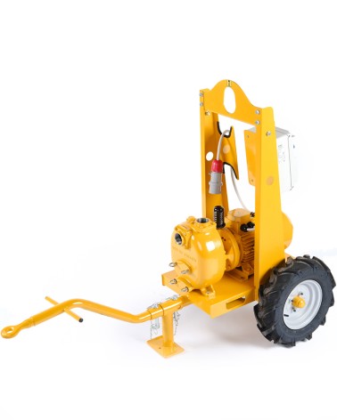 2” Self-priming centrifugal pump in cast iron with mechanical seal, grease-lubricated, non return valve and 11 kW electric motor close coupled, mounted on trailer with towing eye, lifting hook and tyres.