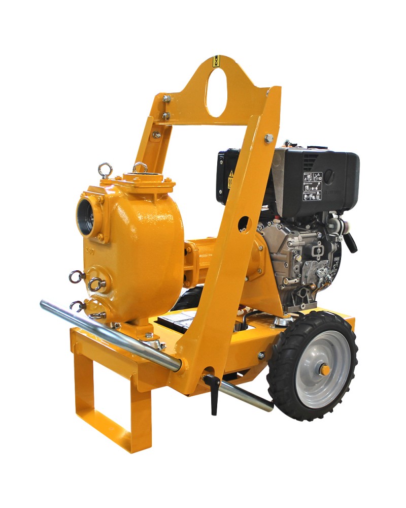 → Motopompa centrifuga autoadescante in ghisa, da 3″, Bi-Block con motore diesel, avviamento elettrico, batteria, su carrello con due ruote “tractor-profile”; per utilizzo pesante nei cantieri.